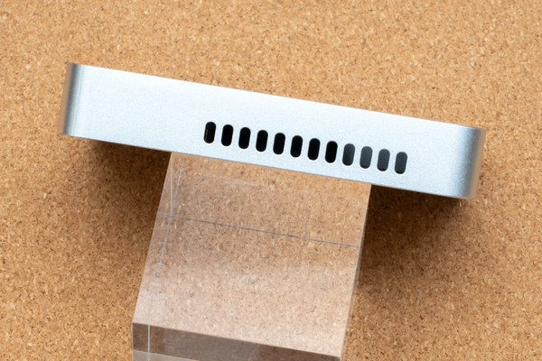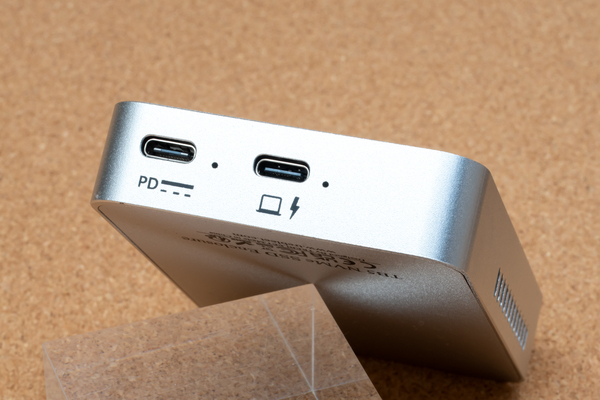 もうひとつのは、Mac miniなどにマッチするシルバーカラーのTREBLEET製(型番なし)Thunderbolt 5対応エンクロージャー(以下 TREBLEET製TB5エンクロ)だ。デザインはシンプルというか、ややチープに感じたが、PD(Type-C)ポートを備えているのが特徴だ。