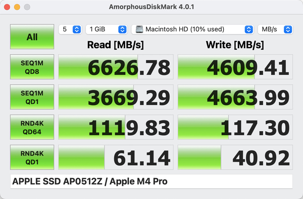 ACASISとTREBLEETのThunderbolt 5対応エンクロージャーに、主なSSDを取り付けて、そのパフォーマンスをチェックしてみた。テストには、M4 Proを搭載するMac mini(macOS Sequoia)を使用し、Mac定番ストレージベンチマークの「AmorphousDiskMark」と「Blackmagic Disk Speed Test」を実行した。