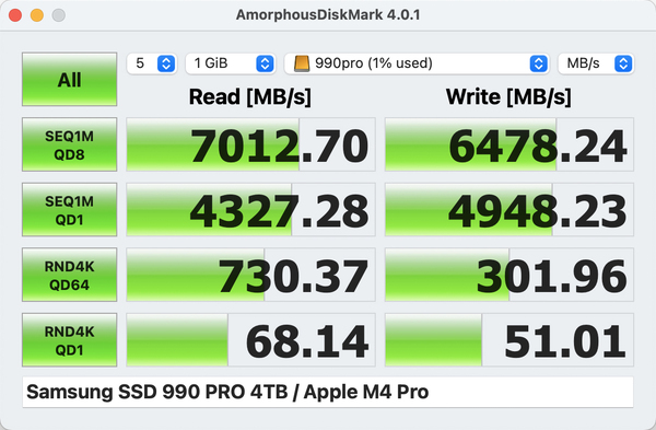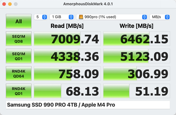 ACASIS「TB501Pro」製品ページのテストでも良好な結果を出していた990 PRO。どちらのエンクロージャーでも、「AmorphousDiskMark」はシーケンシャル読み出し速度6900~7000MB/秒、書き出し速度6400MB/秒を発揮している。「Blackmagic Disk Speed Test」の結果も含め、今回試したSSDのなかでは、トップクラスとなっている。