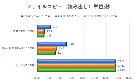続けて外付けストレージへのコピー(書き込み)時間を確認すると、USB4/TB 4エンクロと比べて、45.15GBの圧縮ファイルで最大約6.78秒も短縮し、転送速度も5600MB/秒に達している。動画やRAWもコピー時間は半分に短縮と満足のいく結果となっている。
