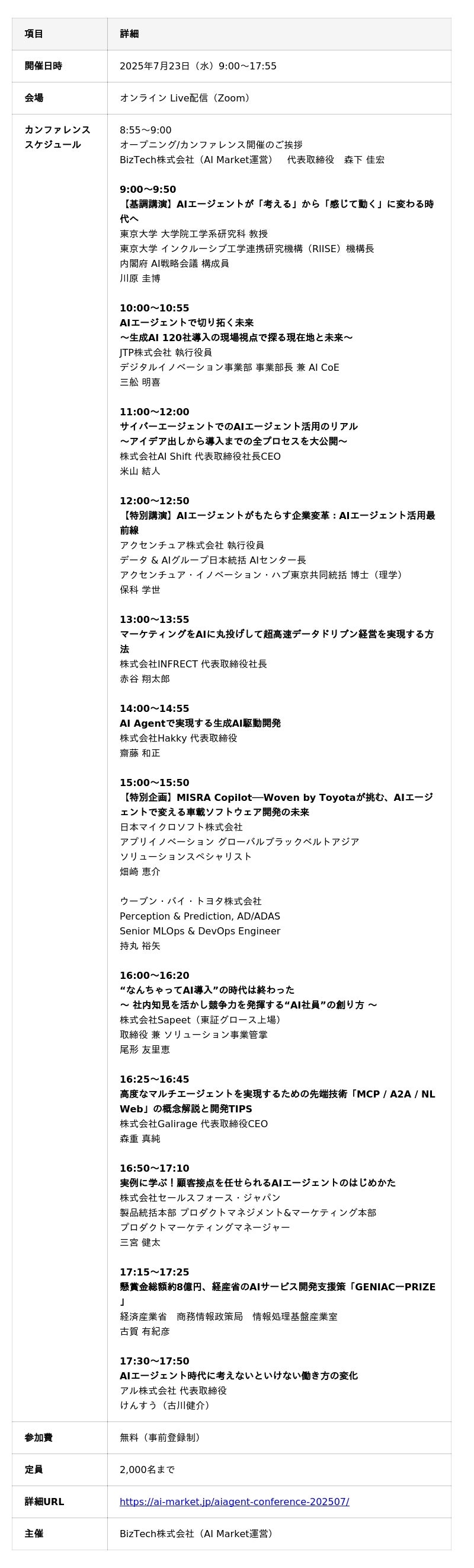 当日は、INFRECTに加え、内閣府AI戦略会議 構成員を務める東京大学川原教授、アクセンチュアAIセンター長 保科氏の他、日本マイクロソフト社やウーブン・バイ・トヨタ社など豪華な講演者が多数登壇します!
