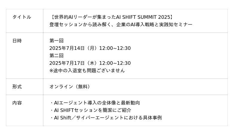 株式会社サイバーエージェント(本社:東京都渋谷区、代表取締役:藤田晋、東証プライム市場:証券コード4751)の100%子会社で、AIエージェントを提供する株式会社AI Shift(本社:東京都渋谷区、代表取締役社長:米山結人)は、AIエージェントの導入戦略と実践ノウハウをテーマとしたオンラインセミナーを開催いたします。