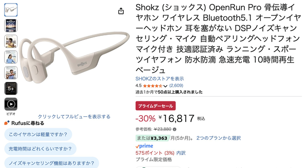 Amazon.co.jpでは、開催中の「プライムデー」セールにおいて、Shokzのハイエンド骨伝導イヤホン「OpenRun Pro」を通常価格から30%オフの1万6817円で販売している。
