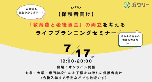 【大学生の保護者必見】ガクシー、教育費と老後資金の両立を考える無料セミナーを7月17日(木)開催