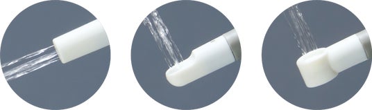 おしり洗浄に適した「ソフトノズル」と「標準ノズル」に加え、当社独自設計の「ストレートノズル」は向けた方向に噴射できるため、用をたす前の事前清掃やペットが汚した路面など、狙った場所をピンポイントで洗える新しい発想の汎用ノズルです。キャンプ場の簡易トイレや海外のトイレでも、必要な箇所だけを的確に洗い流せます。