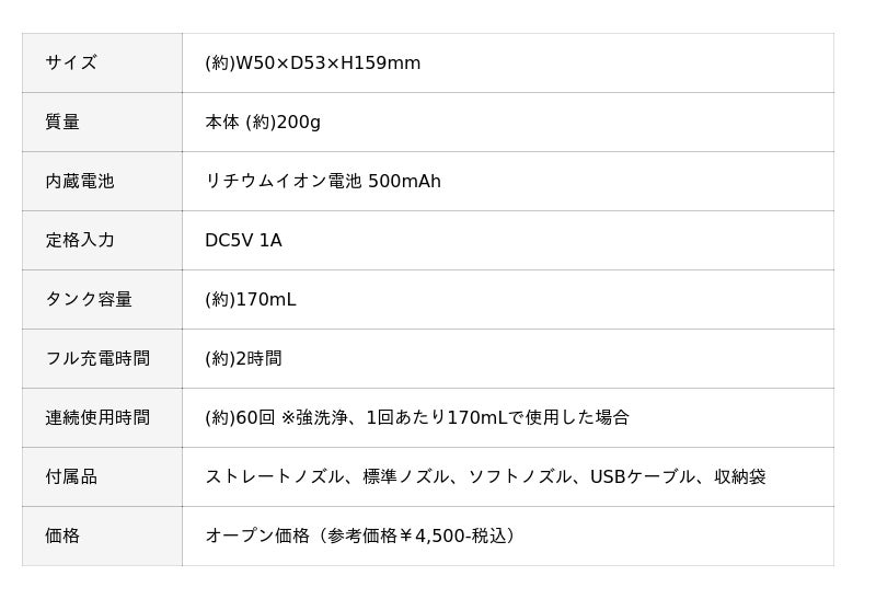 最大640mL/分の吐出量を誇る「強モード」をはじめ、「弱モード」・「リズムモード」の3段階水流で洗浄力とやさしさを両立しています。 水タンク容量170mL、防水性能はIPX4。