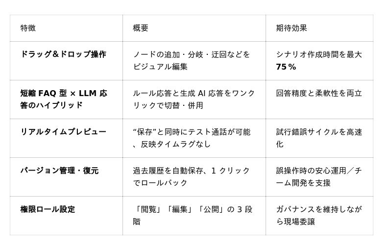 これにより、オペレーターやカスタマーサクセス担当者でも GUI だけで自動応答シナリオを設計・更新 できるようになり、コールセンター運営の俊敏性と属人リスクの低減を実現します。