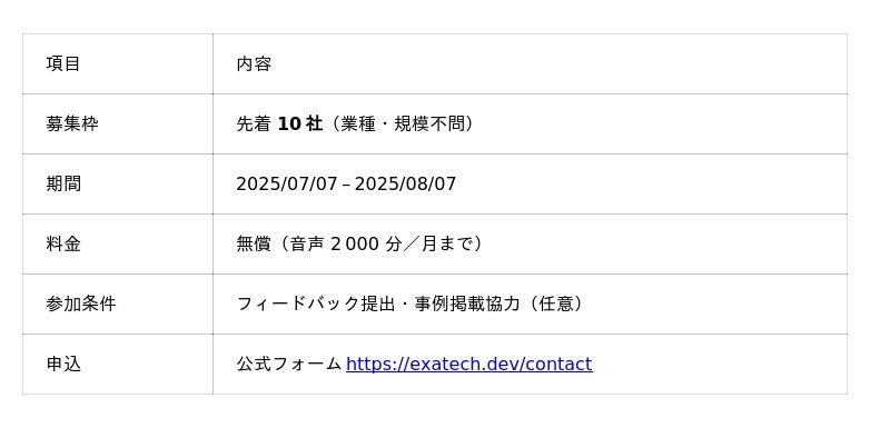 株式会社エクサテック(本社:岩手県盛岡市、代表取締役:大西 洋平太、以下「当社」)は、AI コールセンター支援サービス 「コルサポ」 に新機能 「ノーコード対話フローエディタ」 を追加し、20255年7 月7 日より 10 社限定 で無償トライアルプログラムを開始しました。