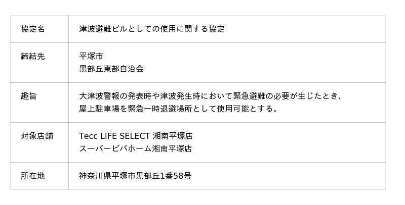 ヤマダホールディングスグループの株式会社ヤマダデンキ(本社:群馬県高崎市、代表取締役社長:佐野 財丈、以下、ヤマダデンキ)は、アークスクエア湘南平塚を共同開発し、当施設にスーパービバホーム湘南平塚店を出店するアークランズ株式会社(本社:新潟県三条市、社長:佐藤 好文)とともに、7月11日(金)平塚市及び黒部丘東部自治会(神奈川県平塚市)と「津波避難ビルとしての使用に関する協定」を締結したことをお知らせいたします。