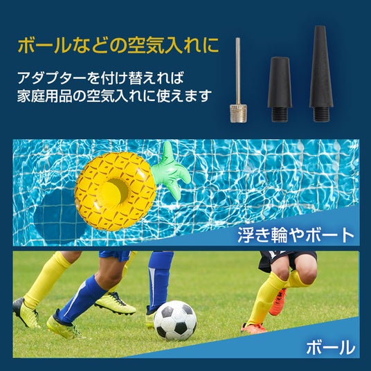 車、バイク、自転車のほか、浮き輪やボールにも対応したアダプター付きで、アウトドアやレジャーにも重宝します。