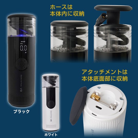 本製品は、車などのタイヤの空気入れや空気圧チェックに使える収納機能付きの充電式電動エアーポンプです。
