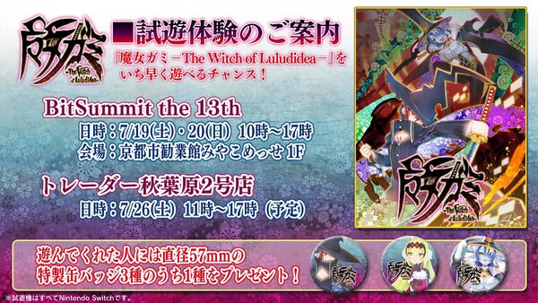 『魔女ガミ-The Witch of Luludidea-』をいち早く遊べるチャンス! 来週開催するゲームイベント「BitSummit the 13th」のインティ・クリエイツブースでプレアブル出展が決定した。さらに再来週には東京・トレーダー秋葉原2号店にて店頭体験会を実施する。