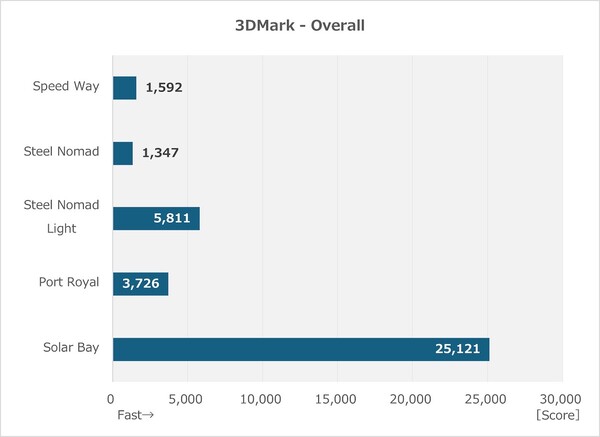 3DMarkはおよそゲームベンチマークから想像のつくとおり。軽量なテストは高スコアだが、高負荷なテストは1000ポイント台となっている。