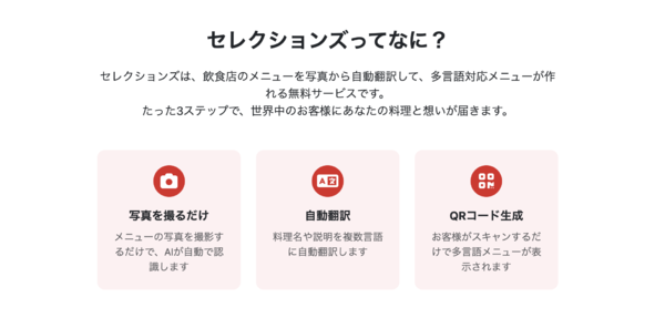 メニュー翻訳サービス「Selections」β版は、予算の少ない個人経営の飲食店に向けたサービス。メールアドレスでログインし、メニュー表の写真を撮って送信すると、AIが文字認識や翻訳を実施。スマートフォンで閲覧できる5言語のメニュー表とQRコードが完成するという。対応言語は英語、中国語、スペイン語、タイ語、韓国語。対応する飲食ジャンルは寿司、焼肉、焼鳥、ラーメン、居酒屋、和食、洋食など多様なジャンルの飲食店に対応するとのこと。使用料は無料だという。