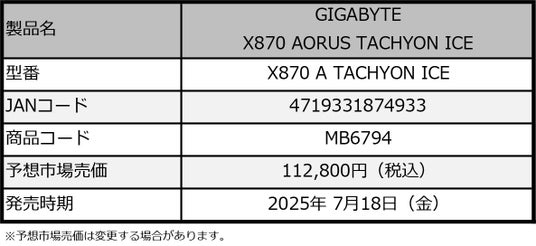 AMD X870チップセットを搭載したホワイト色で OC に特化した TACHYON シリーズのE-ATX マザーボードAmazon限定モデル「GIGABYTE X870 AORUS TACHYON ICE」を2025年7月18日(金)に発売いたします。