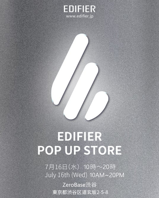 Edifier Japan株式会社は、2025年7月16日(水)から7月21日(月)までの期間限定で、渋谷・スクランブル交差点近くの「ZeroBase渋谷」にて、同ブランド初となるポップアップストアを開催いたします。本イベントでは、最新の完全ワイヤレスイヤホンやスピーカーなど、EDIFIERの人気製品の試聴体験はもちろん、俳優・山崎賢人さんとコラボレーションした特別ブース「心揺さぶるサウンド体験」も登場。圧倒的な音響技術と洗練されたデザインが生み出す、まったく新しいオーディオ体験をお届けします。さらに、ご来場いただいたお客様には、EDIFIERオリジナルグッズや数量限定のプレゼントもご用意。ファンの皆様はもちろん、音にこだわるすべての方々にとって、見逃せないイベントとなっております。
