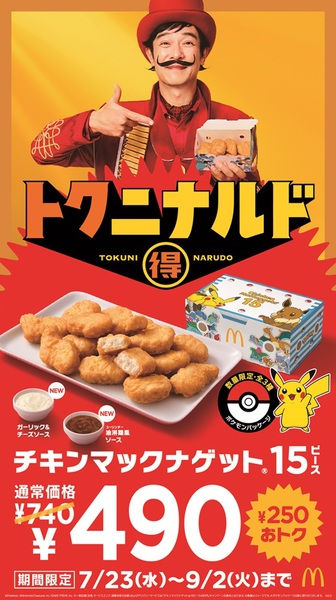 マクドナルドは、サイドメニュー「チキンマックナゲット 15ピース(ソース3個付き)」を特別価格490円で販売するキャンペーンを7月23日~9月2日の期間開催します。