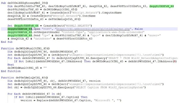 リモートサーバー上のスクリプトによって、「hxxps://dl[.]webcorreio[.]pics/g1/」にホストされている外部VBScriptが注入されます。このVBScriptがHTMLの<head>要素に付加されることで、ユーザーのブラウザ環境内でステルス性の高い実行が可能になります。このスクリプトは、被害者の環境を確認したり、追加のペイロードの配布に役立ちます。