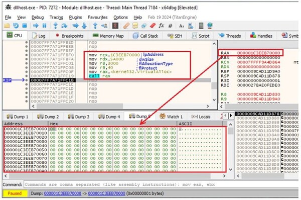 新たに起動されたdllhost.exeプロセス内で、ダンプしたマルウェアを展開するために、私たちは図4に示すようにいくつかの命令を手動で実行しました。侵害されたシステム内と同じベースアドレス(0x1C3EEB70000)で、関連するVirtualAlloc() APIが呼び出されます。