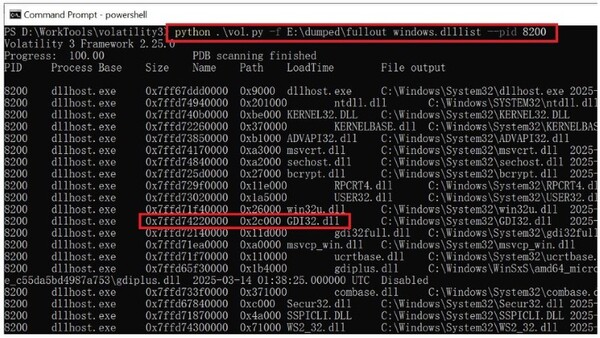 私たちはVolatilityツールを使用して、fulloutファイルから読み込まれたdllhost.exeプロセス(PID 8200)内のモジュールをリストしました。図6を見てわかるように、0x7FFD74224630のAPIはモジュールGDI32.dllからエクスポートされます。