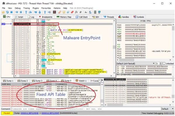 マルウェアを動的に分析するためには、侵害されたシステムの環境をローカルで複製する必要がありました。そのために、dllhost.exeプロセスをデバッガー内で起動して、ダンプしたマルウェアの展開先となるターゲットプロセスとして使用する必要がありました。これにより、マルウェアをローカル分析環境内で分析できるようになります。