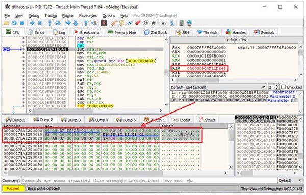 最後の重要な項目は、RSPレジスタのアライメントです。エントリポイントでブレークするときのRSP値の下位4ビットは、図9に示すように0x8でなければなりません。RSPを適切にアライメントできなかった場合、マルウェアの起動時に例外EXCEPTION_ACCESS_VIOLATION(コード0xC0000005)がトリガーされる可能性があります。