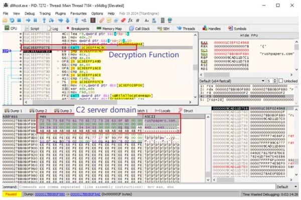 このマルウェアは実行時に、メモリ内に保存されたC2サーバードメイン情報を復号するための関数を呼び出します。図10には、復号関数と、新たに復号されたドメイン詳細が表示されています。ドメインは“rushpapers.com”で、ポート番号は"443"です。