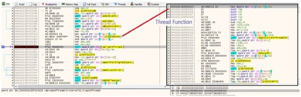 マルウェアはその後、スレッドを作成してC2サーバーとの通信を確立します。図11に示すように、マルウェアは0x1C3EEFDE300にあるスレッド関数を使用して、CreateThread() APIを呼び出す準備をします。