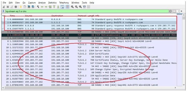 復号されたドメインポート“443”は、マルウェアとC2サーバーとの通信にTLSプロトコルが使用されることを示しています。マルウェアはgetaddrinfo() APIを使用して、ドメイン“rushpapers.com”のIPアドレスをDNSクエリを介して取得します。
