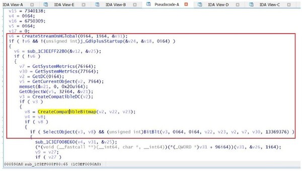 そのために、CreateStreamOnHGlobal()、GdiplusStartup()、GetSystemMetrics()、CreateCompatibleDC()、CreateCompatibleBitmap()、BitBlt()、GdipCreateBitmapFromHBITMAP()、GdipSaveImageToStream()、GdipDisposeImage()などを含む一連のAPIを呼び出します。
