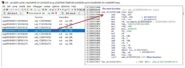 エントリポイント関数のオフセットは、通常はPEヘッダーに保存されていますが、このマルウェアでは違います。当チームは、手動でエントリポイント(スタート関数)を特定する必要がありました。これまでの経験では、エントリポイント関数の最初の命令は、通常は“sub rsp, 28h”としてコンパイルされていますが、この命令は他の関数にも含まれていることがあります。しかし、マルウェアをIDA Proにダンプすることで、この命令のすべての出現箇所をIDA Proのデータベースで探し出すことができました。