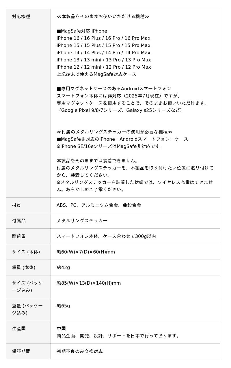 非対応ケースやスマホにも使用ができるようメタルリングが付属しています。