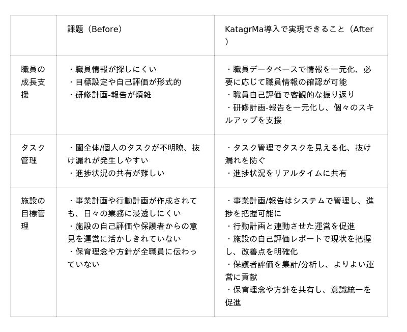 TKC様は17園の保育施設を運営する中で、本部と各園との物理的な距離や情報共有の属人化といった課題を抱えていましたが、「KatagrMa」の導入により、情報のデータ化・一元管理、複数システムとの連携による保育DXを推進。本部と現場の連携強化、職員育成の仕組み化、そして保育の質向上に繋がる成果を上げています。