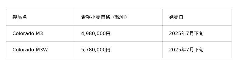 〈Colorado M3/M3Wの主な仕様〉