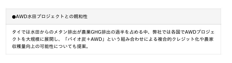特にタイでのAWD(間断灌漑)技術やバイオチャーを活用したカーボンクレジット事業に注力しています。タイでは農業がGDPの主要産業であると同時に、気候変動の影響を大きく受ける地域であり、Green Carbonの技術を導入することで、農業の持続可能性向上とカーボンクレジット市場の活性化が期待されており、タイでの展開を進めています。また、タイ北部・カムペーンペット県で取り組んでいる水田のAWD※1導入によるメタンガス削減プロジェクトが、タイ政府が推進する高品質なボランタリークレジット制度「Premium T-VER※2」に、日本企業初・最大規模のプロジェクトとして、正式にリスト化される等、タイ国内での実績作りも進めています。