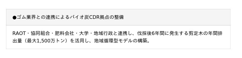 特にタイでは、2024年にRubber Authority of Thailand(RAOT:タイ天然ゴム庁)とのMOUを締結し、全国に広がるゴム農園で発生する剪定枝・伐採木等の未利用資源をバイオ炭化するプロジェクトを本格化させています。今後の注力領域は以下の通りです。