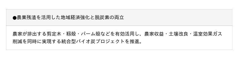 事業内容 :カーボンクレジット創出販売事業、農業関連事業、環境関連事業、その他、関連する事業及びESGコンサルティング事業