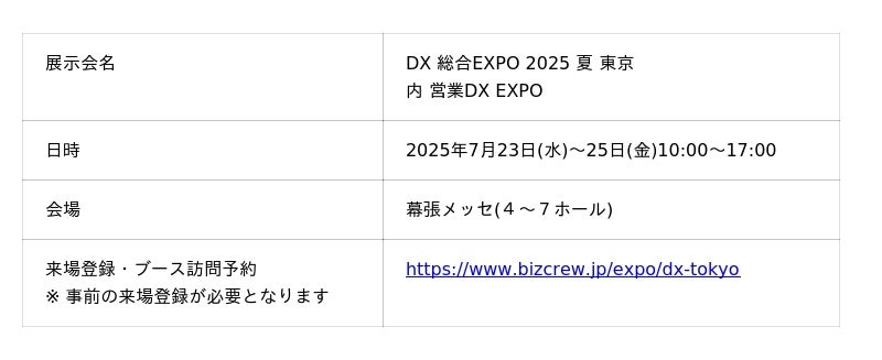 SFAとインサイドセールスで営業のデジタル化と売上の拡大を支援するSALES GO株式会社(所在地:東京都中央区、代表取締役社長:内山 雄輝、以下SALES GO)は、2025年7月23日(水)~25日(金)、幕張メッセで開催される「DX 総合EXPO 2025 夏 東京」内の「営業DX EXPO」に出展いたします。ブースでは、最新のマーケ・営業支援ツールやノウハウ、お客様事例を多数ご紹介いたします。