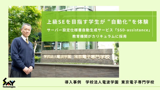 セイ・テクノロジーズ株式会社 (本社:東京都文京区、代表取締役社長:三瓶 千里) は、同社が開発・販売するサーバー設定仕様書自動生成サービス「SSD-assistance」が、教育機関として初めて、学校法人電波学園 東京電子専門学校(所在地:東京都豊島区、学校長:山口 高広)に導入されたことをお知らせいたします。本導入は、IT現場で必須とされる“自動化”スキルを学生に体感させるための授業改革の一環であり、授業における効率化や、教員の採点業務の効率化にも大きな効果をもたらしています。