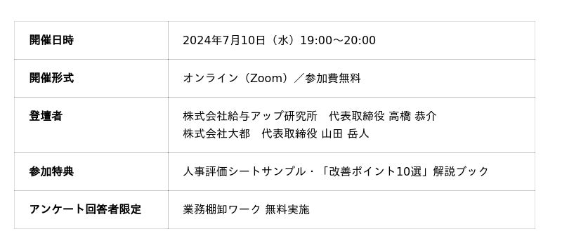 株式会社給与アップ研究所は、「テクノロジー×温もり」を掲げ、人事評価制度を通じて中小企業の事業承継・組織強化・業績向上を支援しています。今後も「ジョブオペ(R)」などのサービスを通じて、後継者の右腕となる評価制度の導入を広げてまいります。【このセミナーに関してのアーカイブ視聴やお問い合わせについて】
