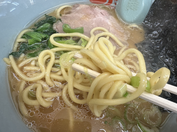 出てきたラーメンは、確かな存在感を放っている。多めの脂に覆われた茶褐色のスープで、トッピングはネギ、ほうれん草、チャーシュー、海苔。その下に隠れる麺は、低加水の中太麺で、しっかりとした食感。