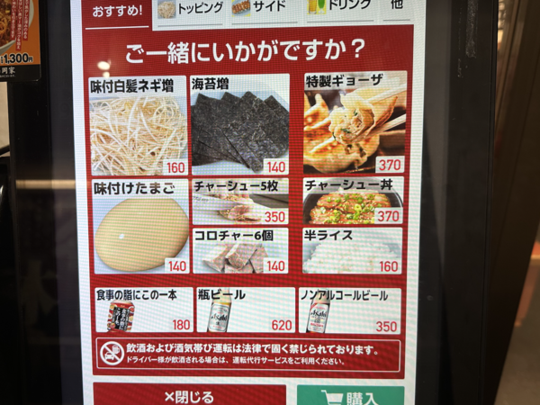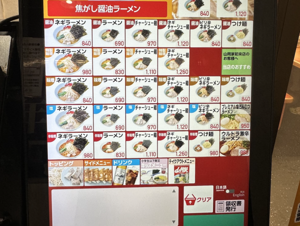 自動販売機で食券を購入し、席につく。はじめての山岡家といいうこともあって、(おそらく)スタンダードな醤油ラーメンを注文。価格は690円。いまどき驚くほど良心的だ。他に「特製味噌」「味噌」「塩」「辛味噌」「ウルトラ激辛」「焦がし醤油」などが選べた。