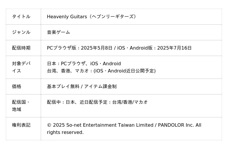 株式会社パンドラ(所在地:東京都渋谷区、代表取締役社長:森先一哲、以下当社)は、エレキギターにフォーカスした対戦型音楽ゲーム『Heavenly Guitars(ヘブンリーギターズ、以下本作)』のiOS/Android版アプリを、本日2025年7月16日よりリリースいたしました。