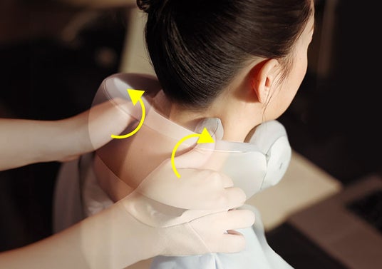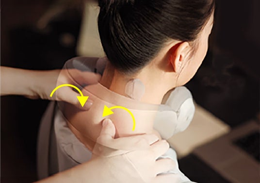 3つの負担を軽減ヘッドホンのような形状の弾力のあるクッションが、首にかかる負担、締め付けの負担、もみ玉の動作による振動の負担、3つの負担を劇的に軽減します。しっかりとホールドするだけでなく、快適性を上げる役目も担っています。