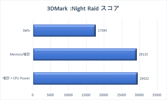 軽量テストとあって「Night Raid」は、デフォルト構成でもスコアは1万7000ポイントを記録し、フレームレートも余裕で60fpsを超えている。カスタマイズ後はさらにスコアとフレームレートが伸びている。
