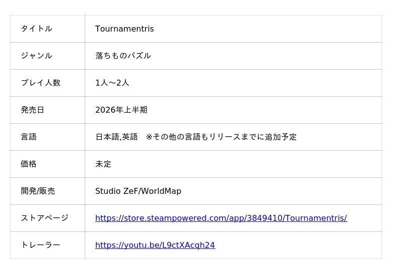 インディーゲームレーベルWorldMap(運営:株式会社トライシステム)は、Studio ZeFが開発する新作ゲーム『Tournamentris』のSteamストアページ及びトレーラーを公開しました。