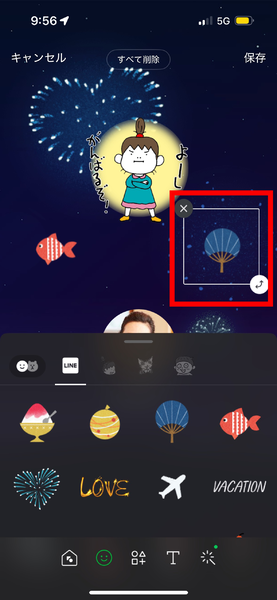 スタンプも同様に、「デコ」→「スタンプ」→好きなスタンプや絵文字を選び、右上の「保存」をタップでスタンプや絵文字が配置できる。