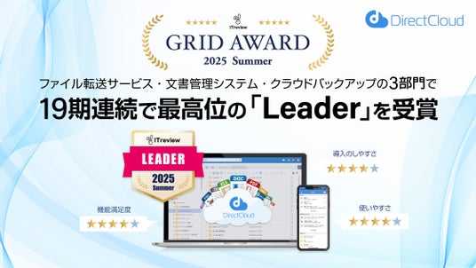 ファイルサーバーのDXから生成AIまでサポートする株式会社ダイレクトクラウド(本社:東京都港区、代表取締役:安 貞善、以下ダイレクトクラウド)が提供する、法人向けクラウドストレージ「DirectCloud」は、アイティクラウド株式会社(本社:東京都港区、代表取締役社長兼CEO:黒野 源太)が運営するIT製品レビュープラットフォーム「ITreview(アイティレビュー)」において、「ITreview Grid Award 2025 Summer」の3部門で19期連続最高位の「Leader」を受賞しました。