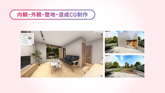 リノベーション中の住戸内装、建築中の物件の外観、造成後イメージなどの作成・提供を行っています。図面だけでは伝わらない完成イメージをCGを使って伝えられることで、商談の質があがり結果、早期成約やお客様との認識のズレを埋めることができるようになったとご好評を頂いています。