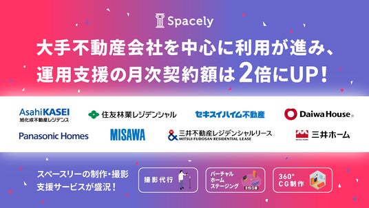今般、提供サービスの一つである運用支援サービスにおいて、月額課金契約額が、2024年4月から2025年4月の1年で1.88倍と約2倍と大きく成長したことをお伝えします。大手ハウスメーカーや大手不動産デベロッパーによる利用が増加し、現在は大和ハウス工業株式会社や旭化成不動産レジデンス株式会社はじめ多くの事業者がスペースリー制作・撮影支援サービスを利用しています。